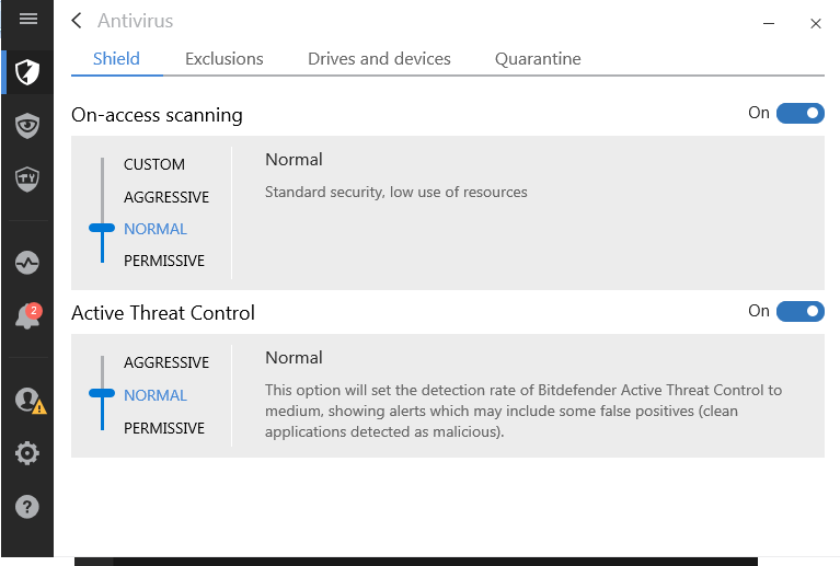 - The on-access scanning and active threat control is switched to ‘on’ by default.